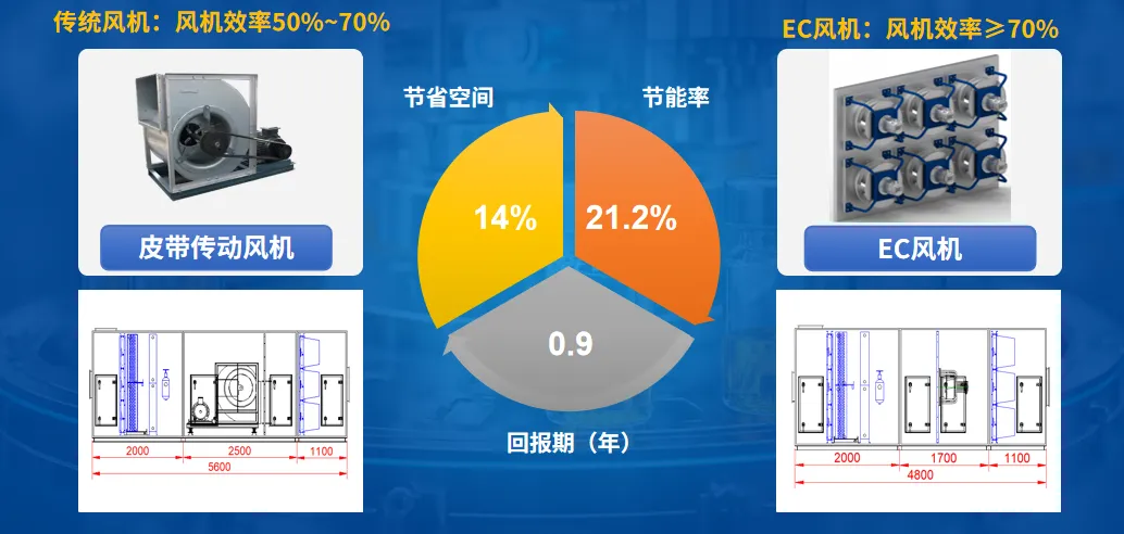 EK工業空調發起EC變頻普及風暴,用“EC風墻”技術提升風機運行效率和備用安全,對比傳統風機節能率高達21.2%,同時節省空間14%。